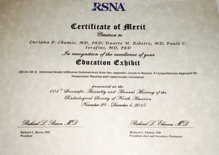 Dr. Duarte Miguel recebeu em Dezembro de 2015 o prêmio de Excelência pelo trabalho: “ENDOMETRIOSE INTESTINAL INFILTRATIVA DO ILEO-APÊNDICE-CECO ATÉ RETO. CORRELAÇÃO DO PLANEJAMENTO PRÉ-OPERATÓRIO COM A LAPAROSCOPIA”  na 101 Assembleia Científica e Encontro Anual da Sociedade de Radiologia da América do Norte.